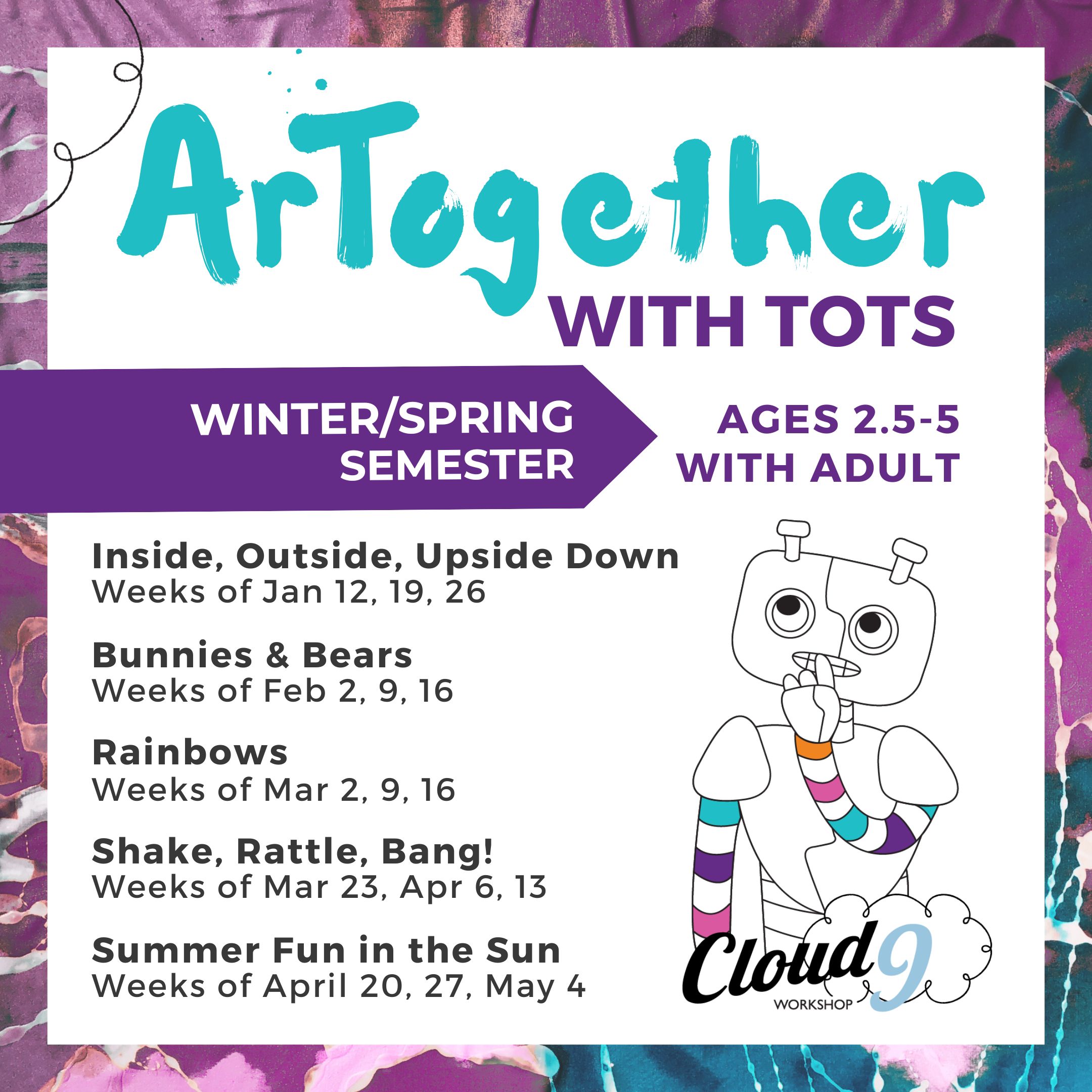 ArTogether with Tots is a delightfully hands-on, art focused workshop- designed for young children, ages 2.5-5, WITH their adults.